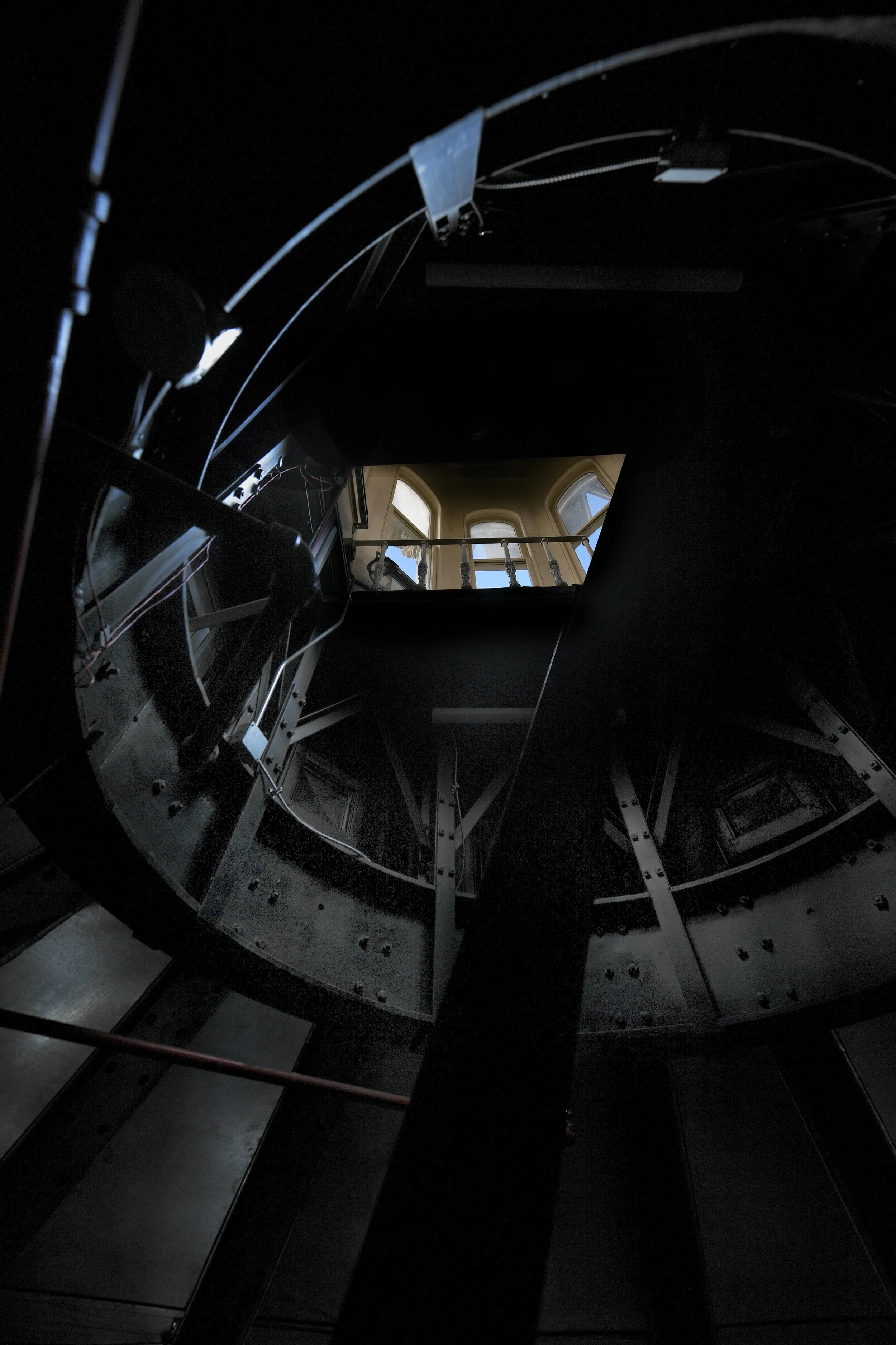 Dave Thompson’s photograph of the Capitol’s Lantern Level transforms historic architecture into cinematic art. Emerging from deep shadow, the cast iron spiral stairway draws the eye upward, its riveted metal and sweeping curves echoing the decreasing radius of the dome above.