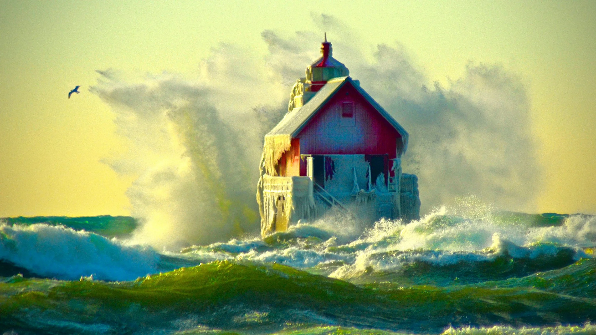 This iconic Michigan lighthouse rises from the lake, its red walls glowing against the cold as ice clings like crystalline armor. Below, green and blue water surges, throwing spray into a pale, golden sky.
