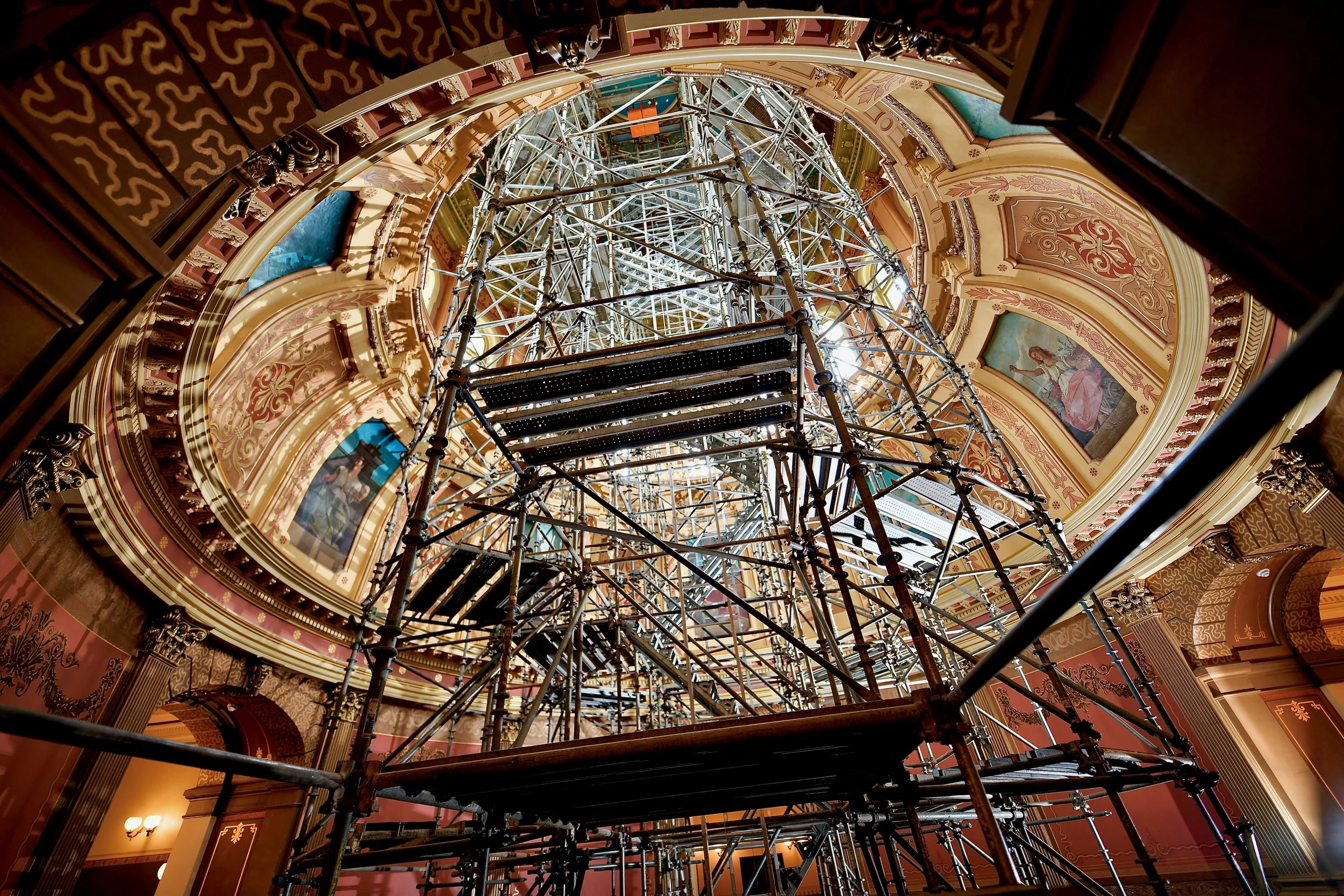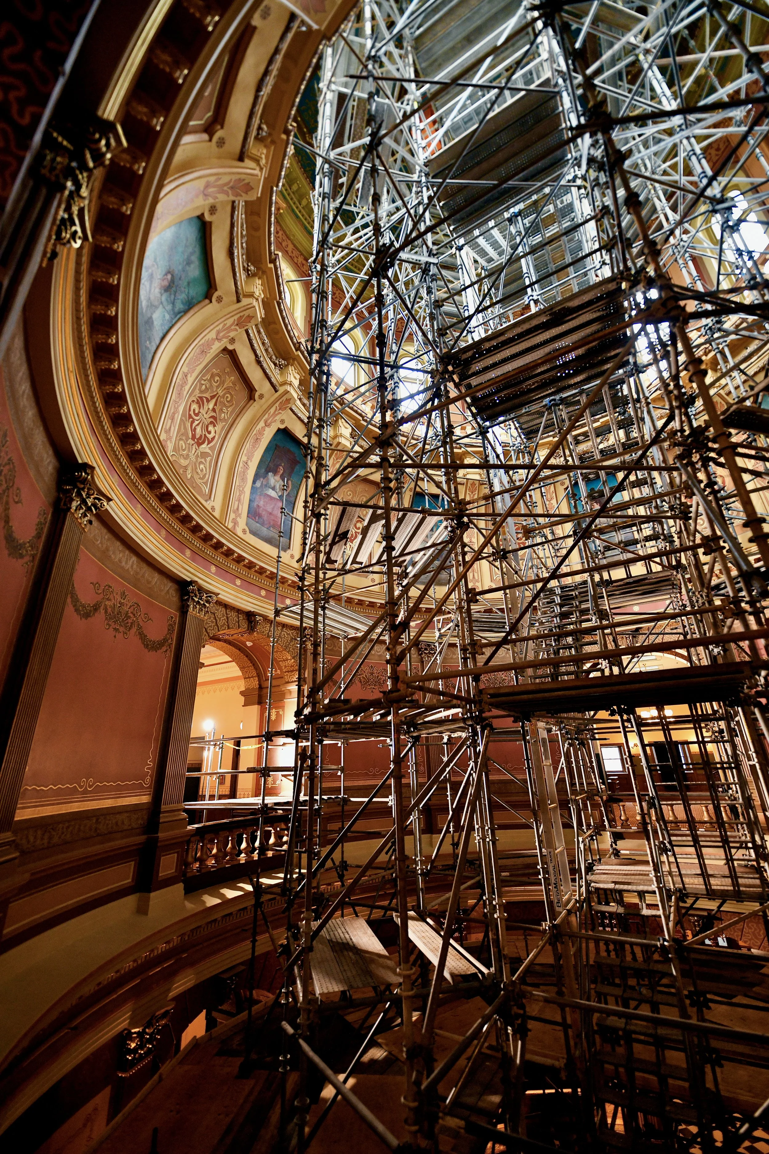 Dave Thompson focuses his photography on capturing the process of historic preservation and the careful work that brings structures, artwork and artifacts back to life. Through images of exteriors and interiors at various stages of restoration, he records the transformation of historic structures as it unfolds, scaffolding in place, materials exposed, and original details being repaired or rediscovered. His photographs serve as an honest visual record of preservation in action, emphasizing progress, craftsmanship, and the passage of time, in addition to the final result.